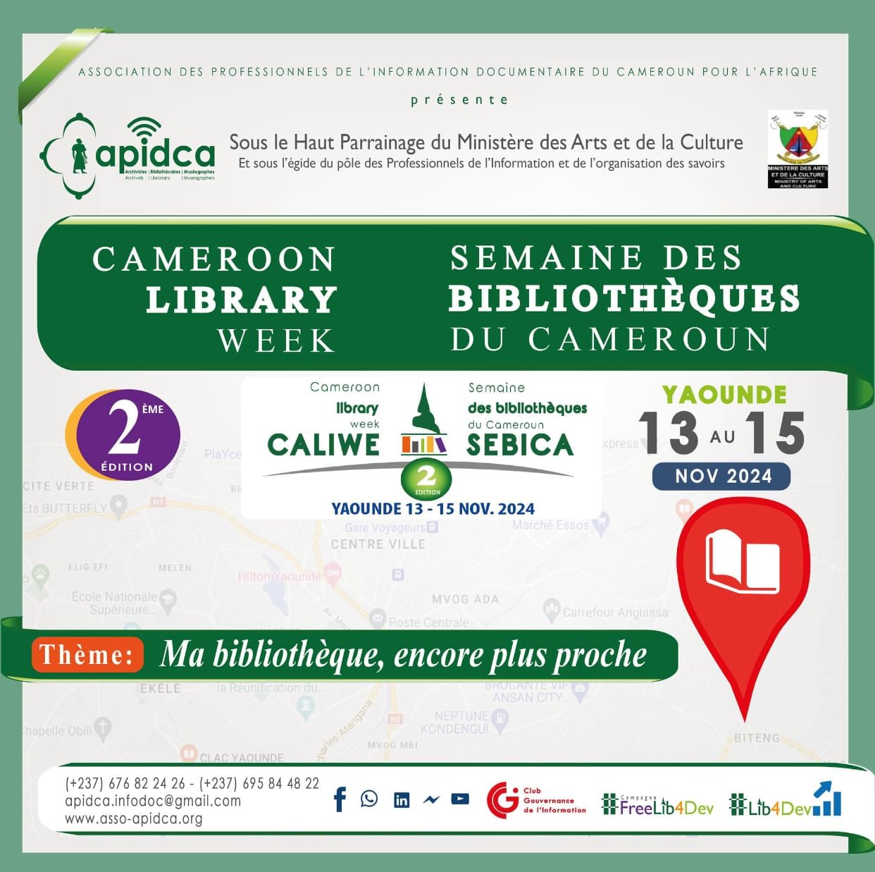 Du 13 au 15 novembre 2024, l’Association des Professionnels de l’Information Documentaire du Cameroun (APIDCA) a le plaisir d’annoncer la tenue de la 2ème édition de la Semaine des Bibliothèques du Cameroun (SEBICA), aussi appelée la Semaine des Bibliothèques du Cameroun (CALIWE). L’événement est programmé pour avoir lieu dans la vibrante ville de Yaoundé.